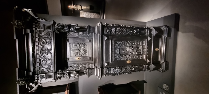Både i tekstiler og i treskurd ser vi påvirkningen utenfra, for eksempel i rike akantusskjæringer eller silkebrokader og rutaliv.